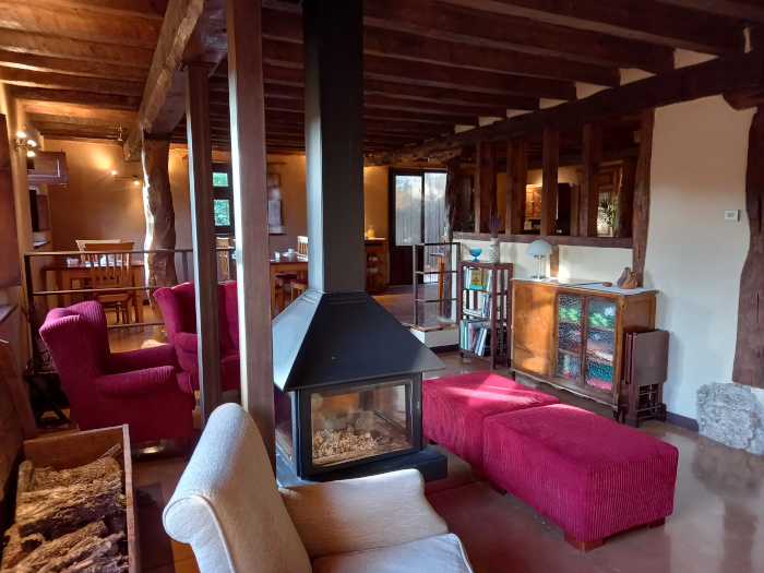 - Ambiente salón-comedor de 65 m2, compuesto de salón con estufa de leña panorámica, amplio comedor con puerta de salida al jardín, y singular espacio de la chimenea pinariega.
